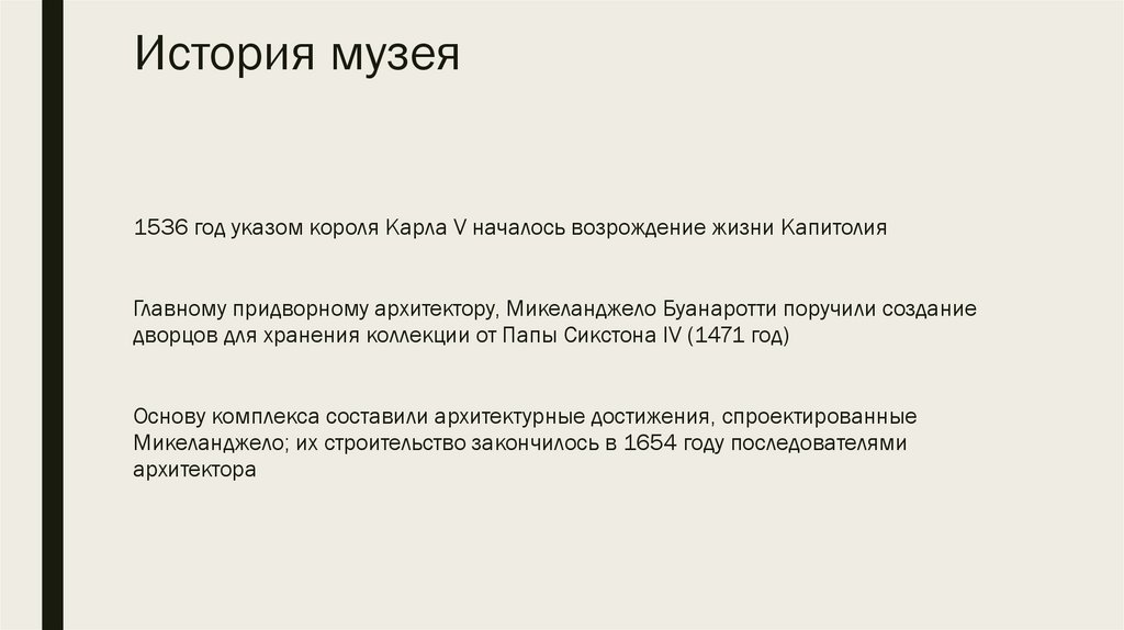История музея1536 год указом короля Карла V началось возрождение жизни Капитолия