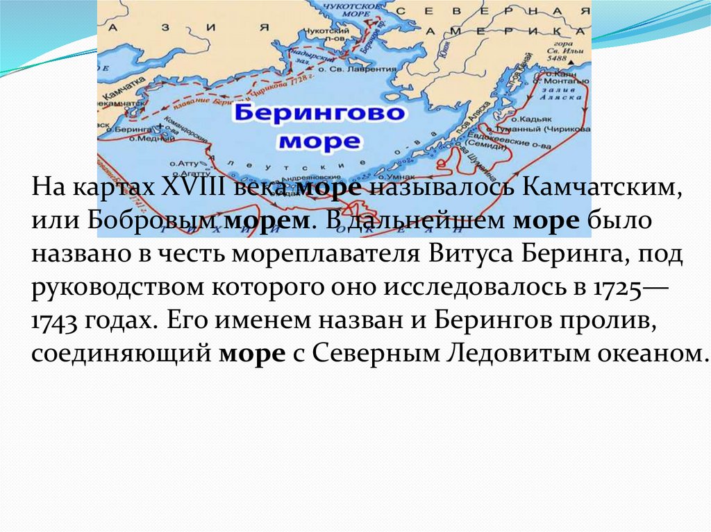 На картах XVIII века море называлось Камчатским,или Бобровым морем. В дальнейшем море было