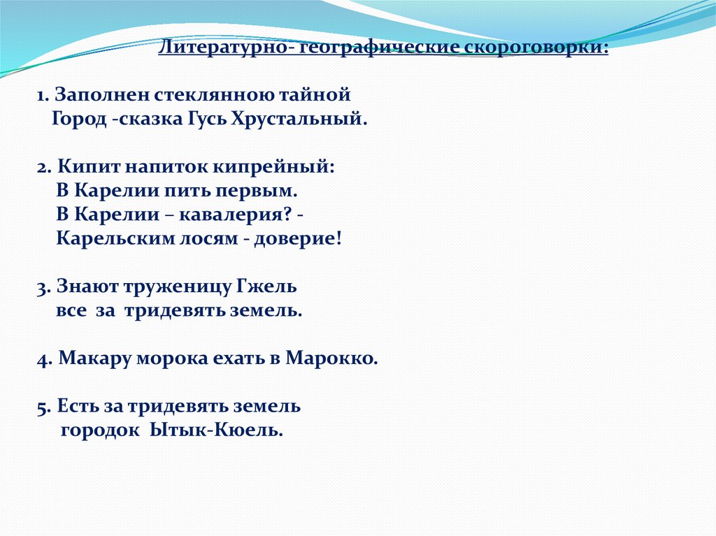 Литературно- географические скороговорки:1. Заполнен стеклянною тайной