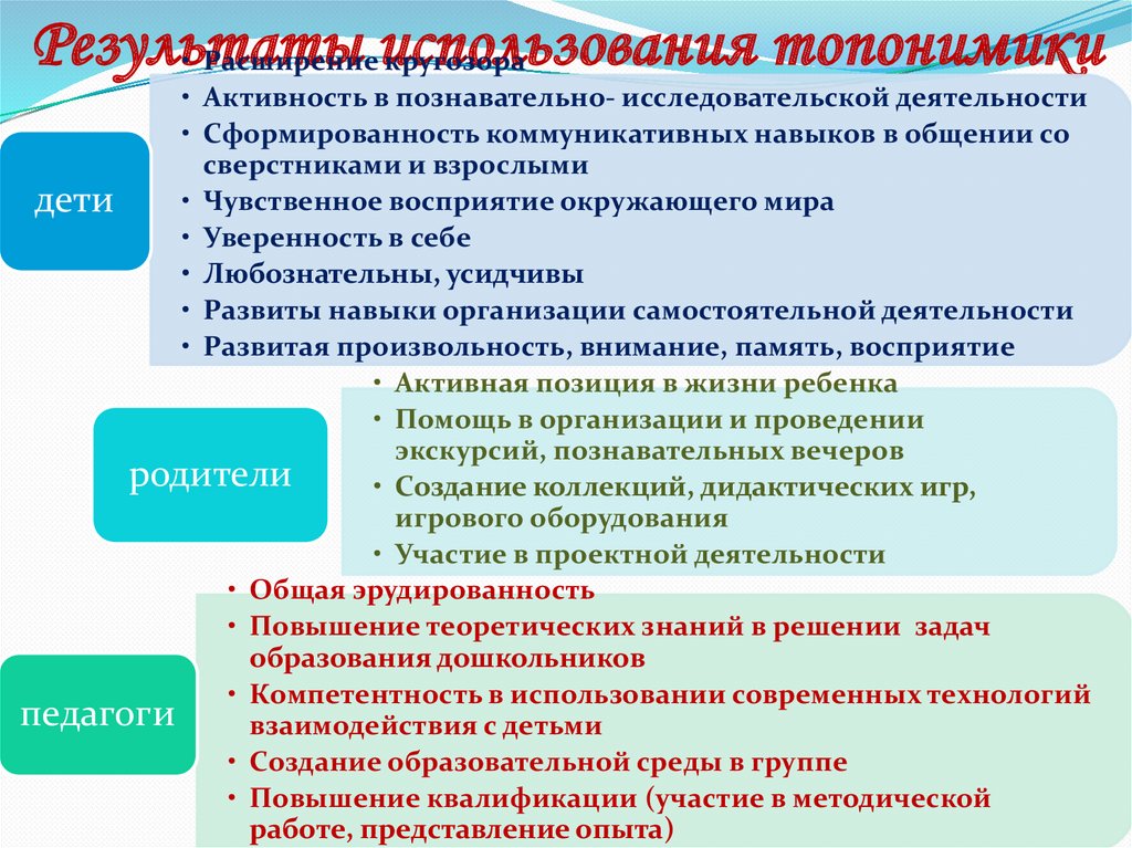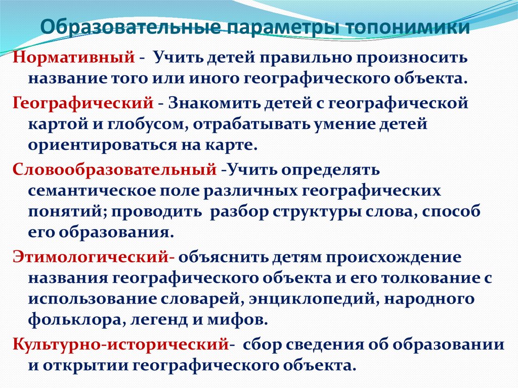 Образовательные параметры топонимикиНормативный - Учить детей правильно произносить