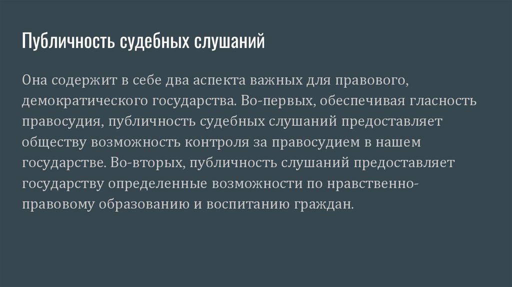 Публичность судебных слушанийОна содержит в себе два аспекта важных для правового,