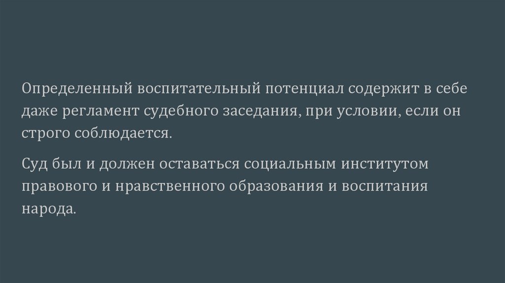 Определенный воспитательный потенциал содержит в себедаже регламент судебного заседания, при условии, если он