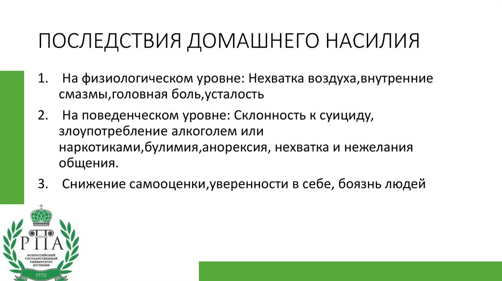 ПОСЛЕДСТВИЯ ДОМАШНЕГО НАСИЛИЯ1. На физиологическом уровне: Нехватка воздуха,внутренние