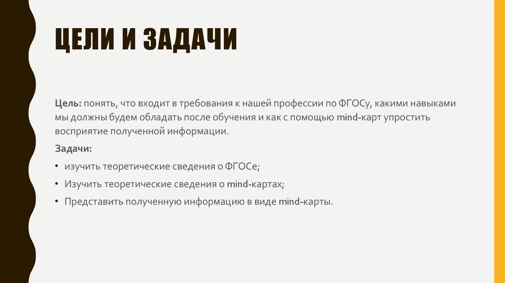 ЦЕЛИ И ЗАДАЧИЦель: понять, что входит в требования к нашей профессии по ФГОСу, какими навыками