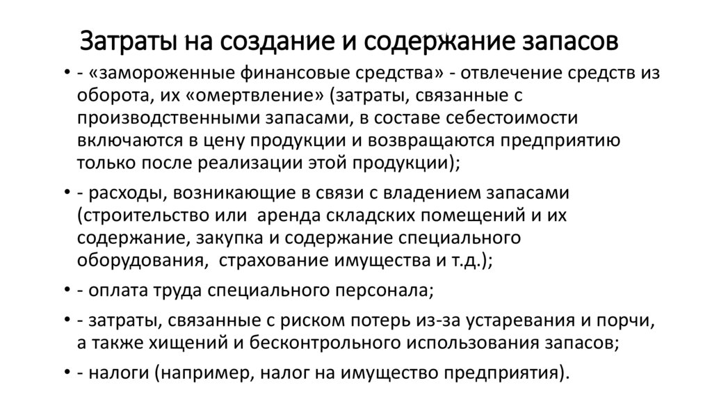 Затраты на создание и содержание запасов• - «замороженные финансовые средства» - отвлечение средств из