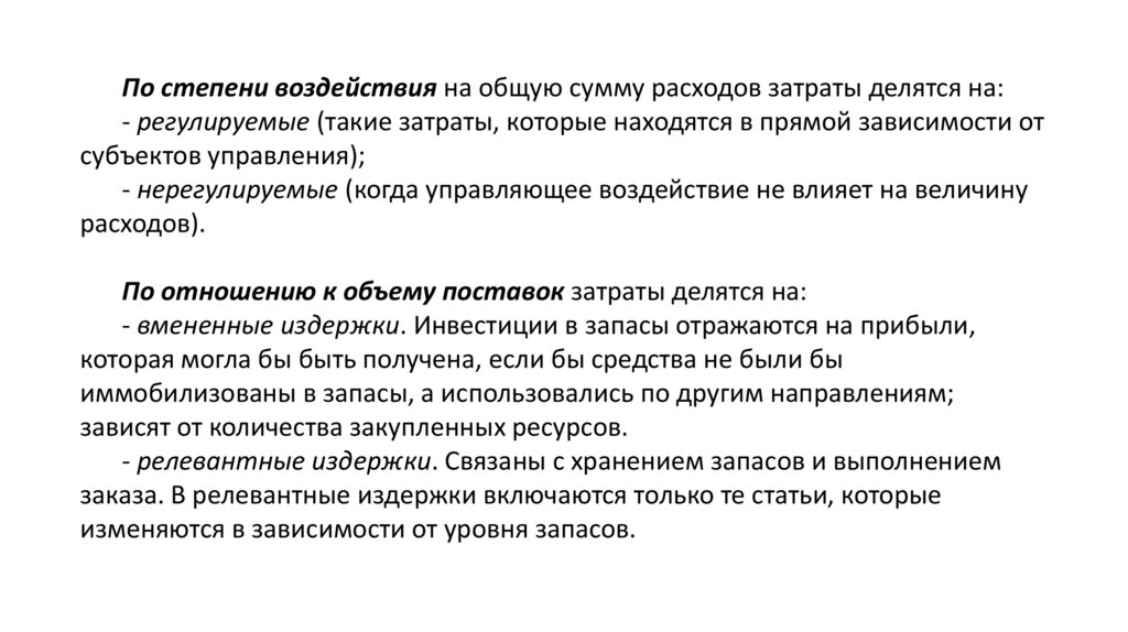 По степени воздействия на общую сумму расходов затраты делятся на:- регулируемые (такие затраты, которые находятся в прямой зависимости от