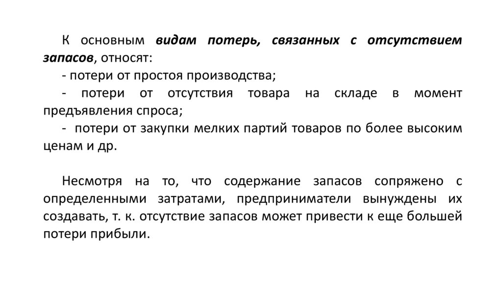 К основным видам потерь, связанных с отсутствиемзапасов, относят: