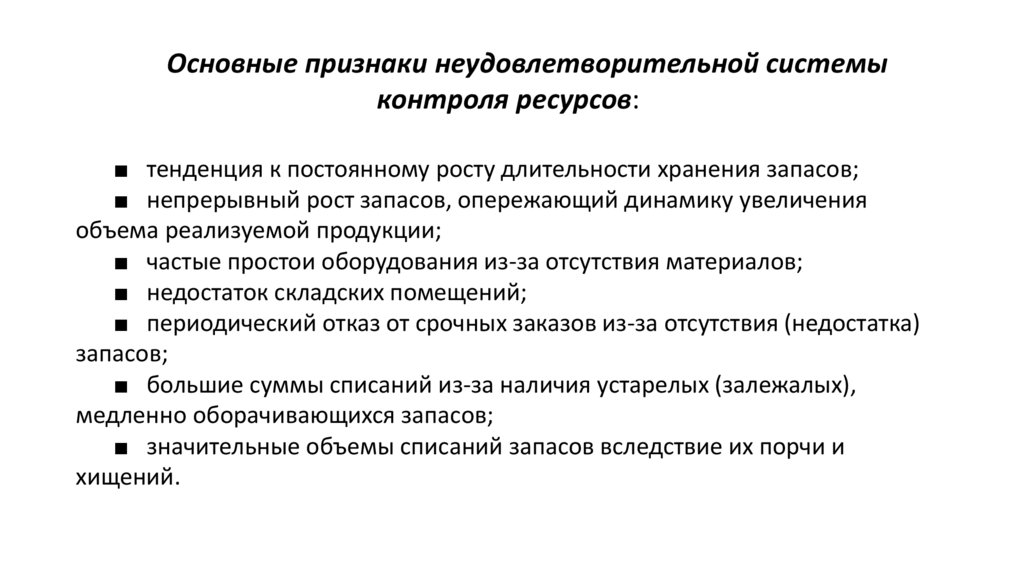 Основные признаки неудовлетворительной системыконтроля ресурсов: