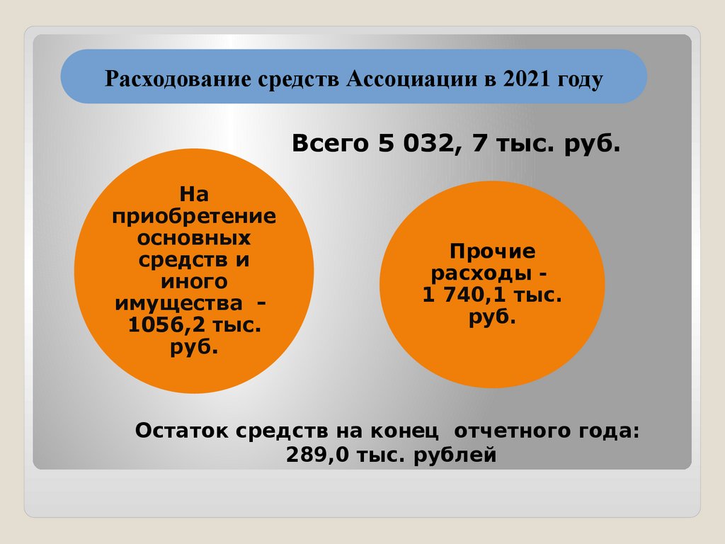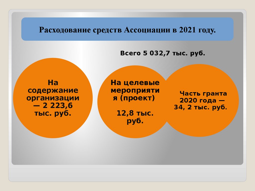 Расходование средств Ассоциации в 2021 году.Всего 5 032,7 тыс. руб.