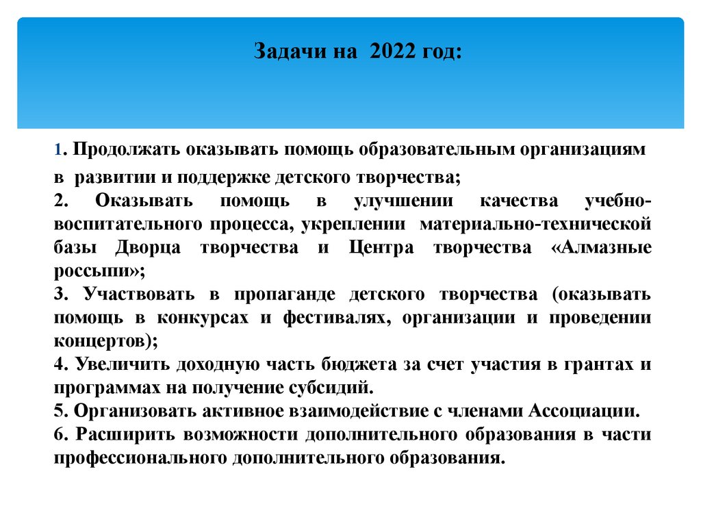 Задачи на 2022 год:1. Продолжать оказывать помощь образовательным организациям