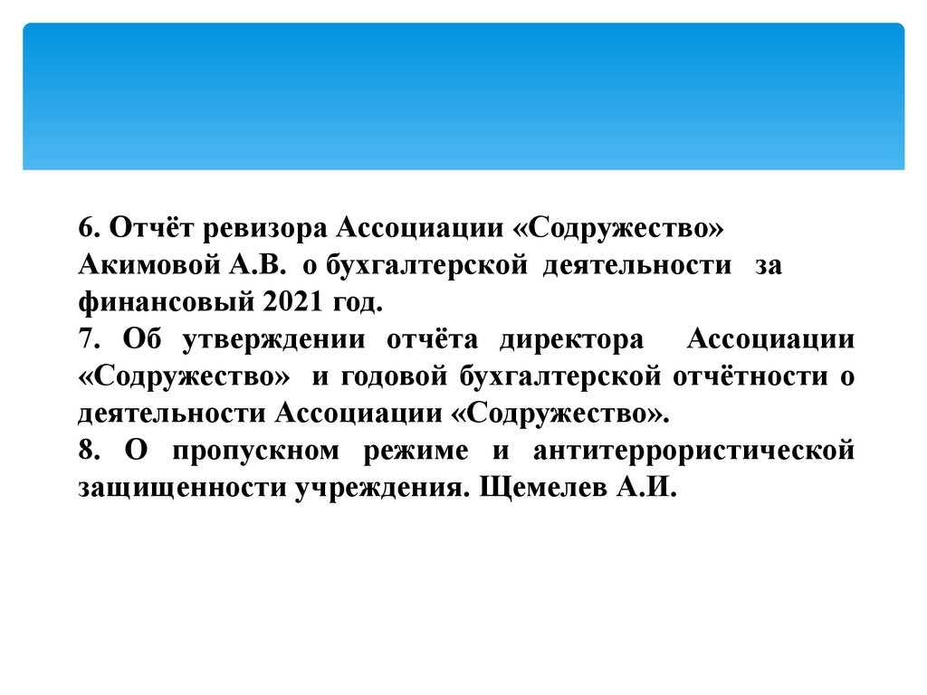 6. Отчёт ревизора Ассоциации «Содружество»Акимовой А.В. о бухгалтерской деятельности за
