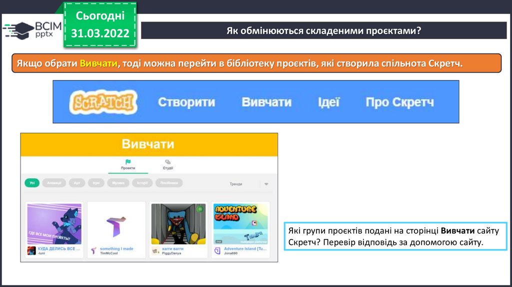 Якщо обрати Вивчати, тоді можна перейти в бібліотеку проєктів, які створила спільнота Скретч.