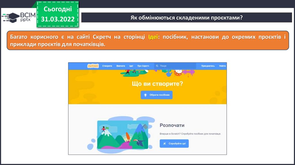 Багато корисного є на сайті Скретч на сторінці Ідеї: посібник, настанови до окремих проєктів і