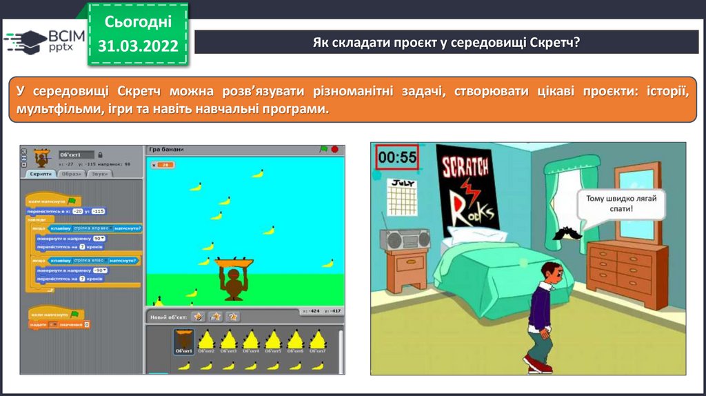 У середовищі Скретч можна розв’язувати різноманітні задачі, створювати цікаві проєкти: історії,