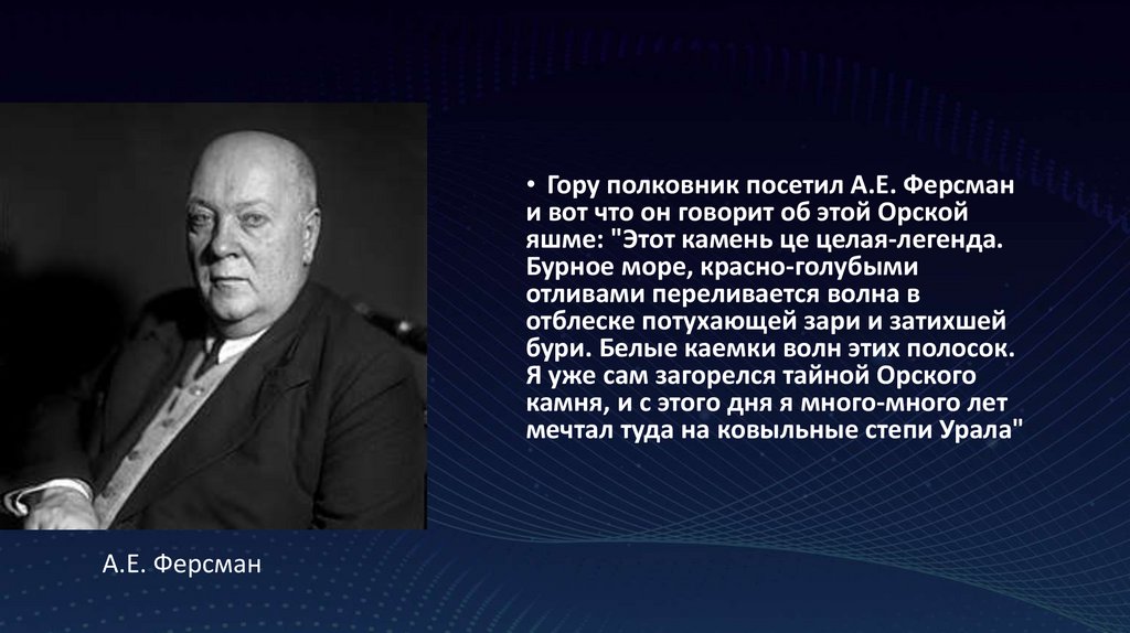 • Гору полковник посетил А.Е. Ферсмани вот что он говорит об этой Орской