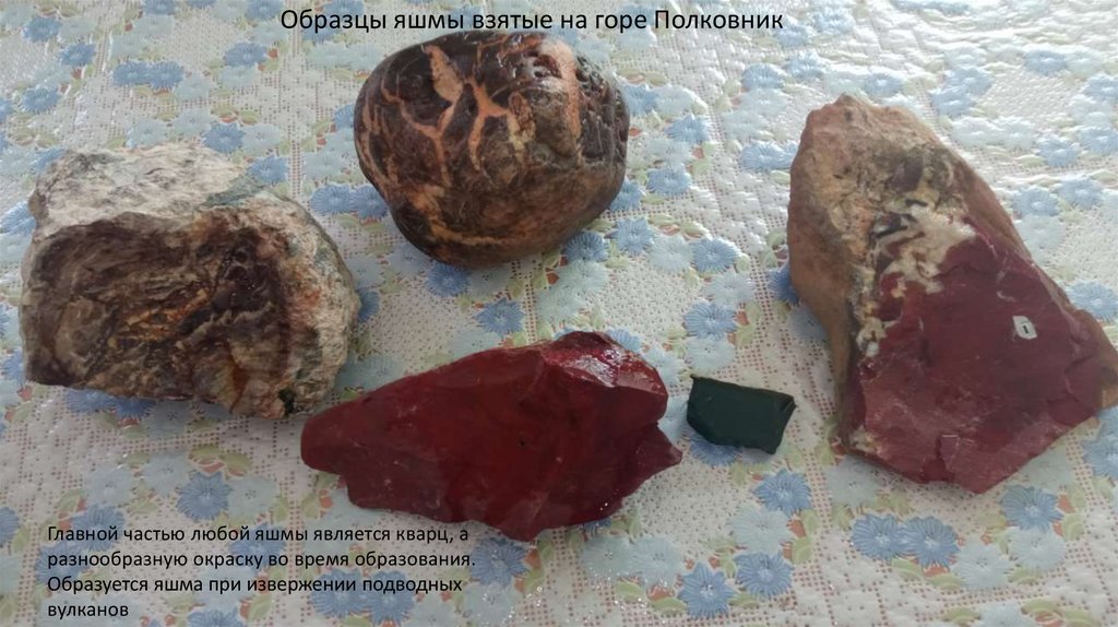 Образцы яшмы взятые на горе ПолковникГлавной частью любой яшмы является кварц, а