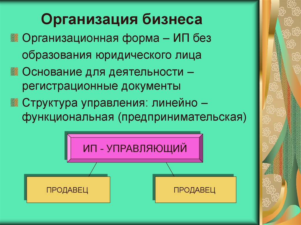 Организация бизнесаОрганизационная форма – ИП без