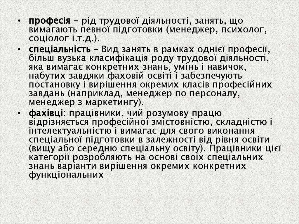 • професія - рід трудової діяльності, занять, щовимагають певної підготовки (менеджер, психолог,