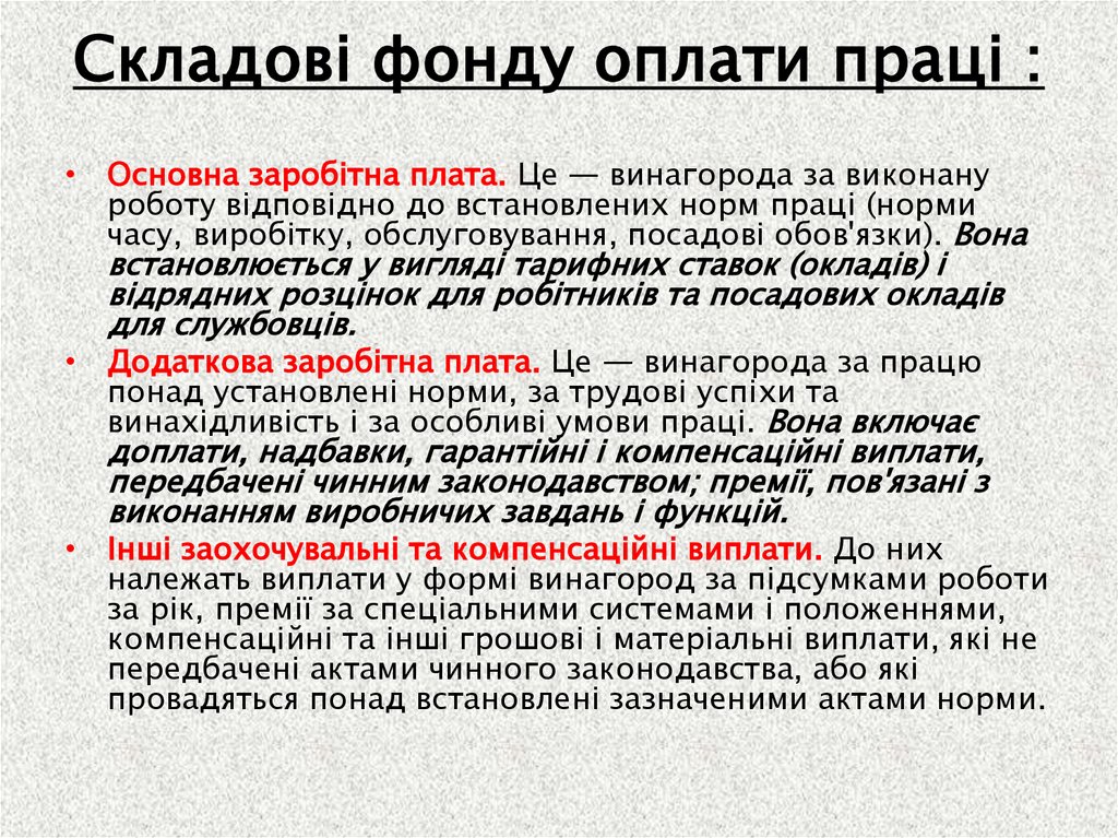 Складові фонду оплати праці :• Основна заробітна плата. Це — винагорода за виконану