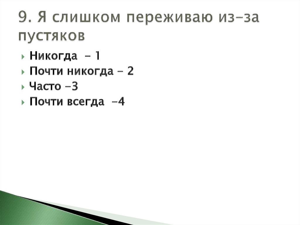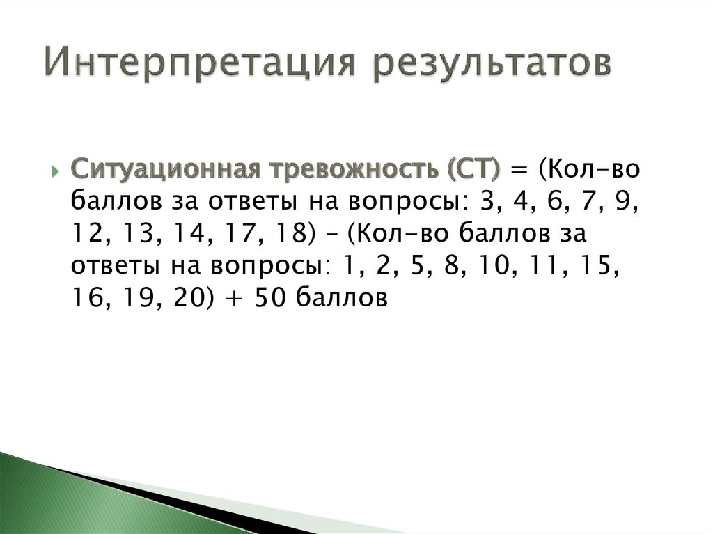 Ситуационная тревожность (СТ) = (Кол-вобаллов за ответы на вопросы: 3, 4, 6, 7, 9,