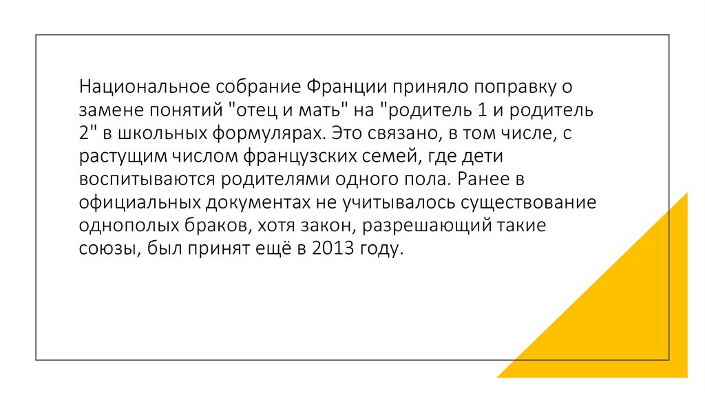 Национальное собрание Франции приняло поправку озамене понятий "отец и мать" на "родитель 1 и родитель