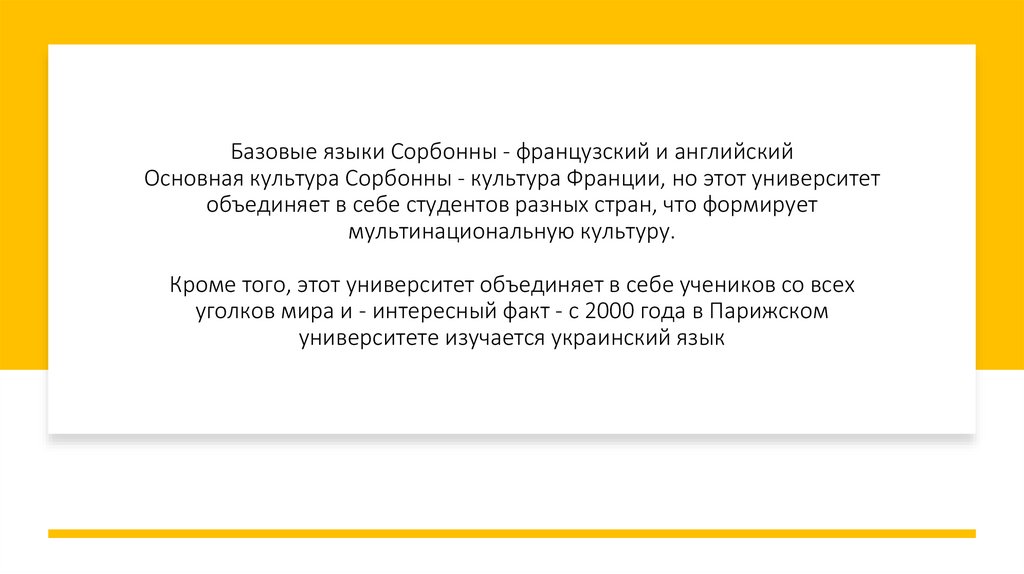 Базовые языки Сорбонны - французский и английскийОсновная культура Сорбонны - культура Франции, но этот университет