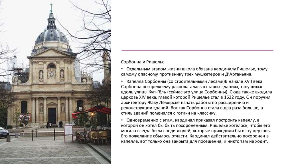 Сорбонна и Ришелье• Отдельным этапом жизни школа обязана кардиналу Ришелье, тому