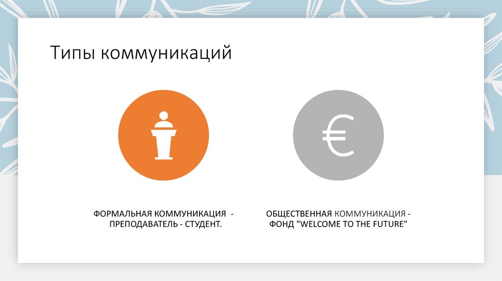 Типы коммуникацийФОРМАЛЬНАЯ КОММУНИКАЦИЯ ПРЕПОДАВАТЕЛЬ - СТУДЕНТ.