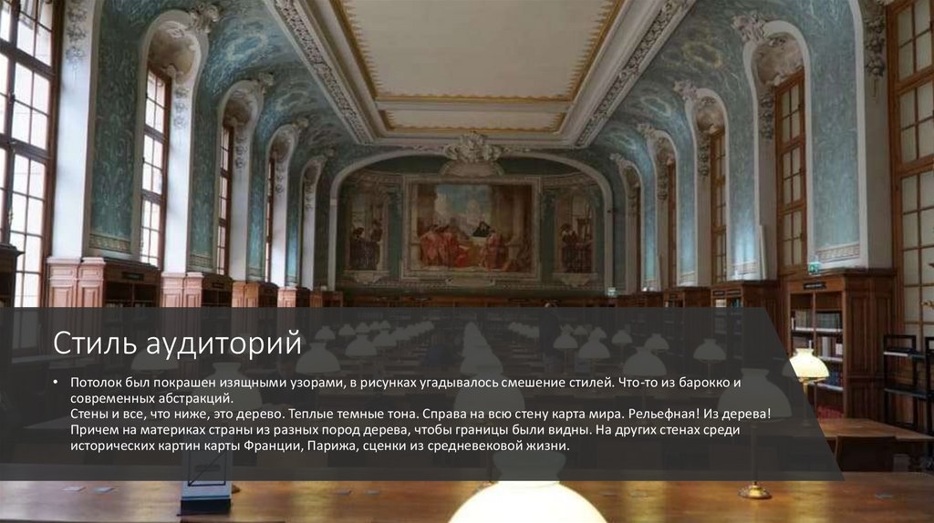 Стиль аудиторий• Потолок был покрашен изящными узорами, в рисунках угадывалось смешение стилей. Что-то из барокко и