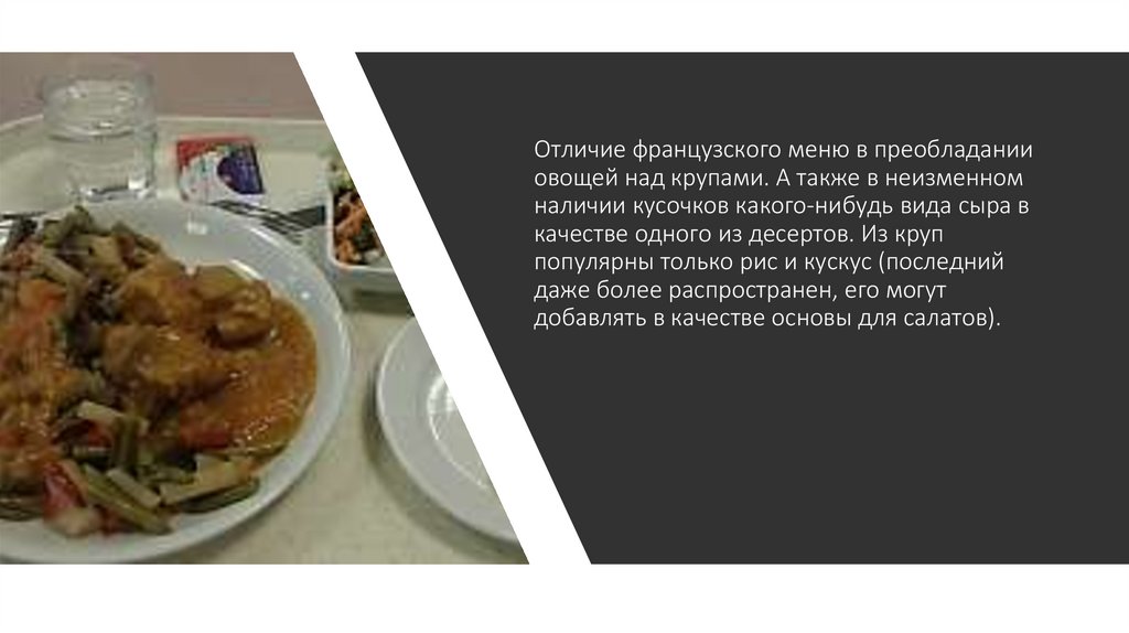 Отличие французского меню в преобладанииовощей над крупами. А также в неизменном