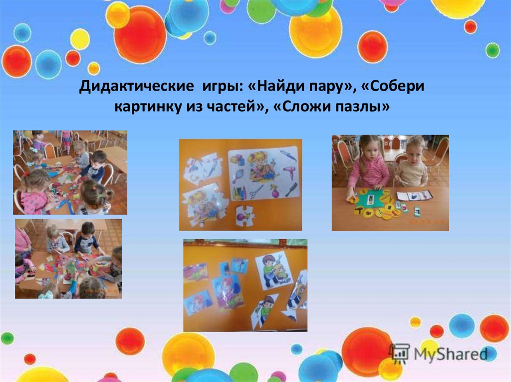 Дидактические игры: «Найди пару», «Соберикартинку из частей», «Сложи пазлы»