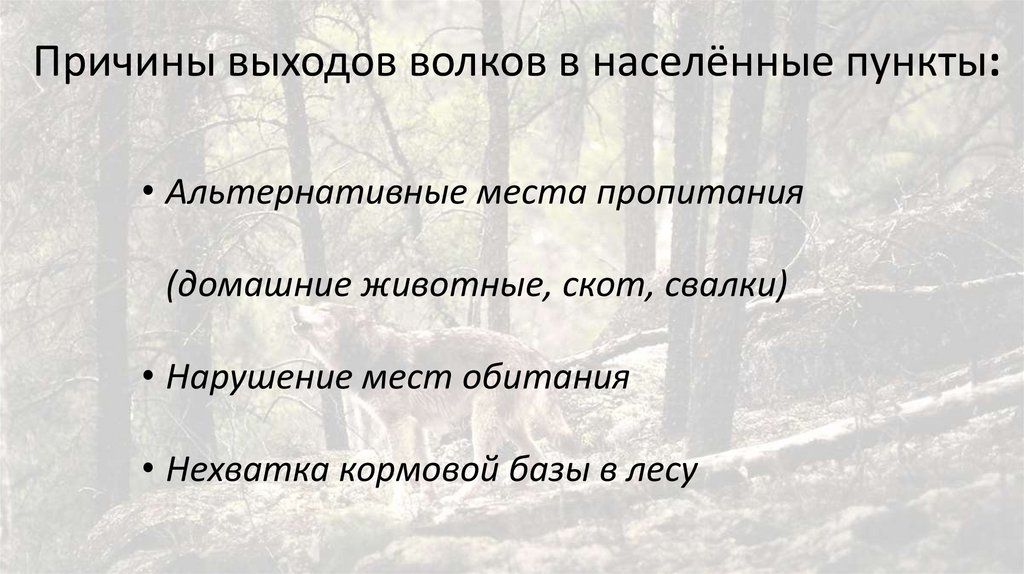 Причины выходов волков в населённые пункты:• Альтернативные места пропитания