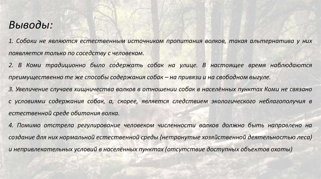 Выводы:1. Собаки не являются естественным источником пропитания волков, такая альтернатива у них
