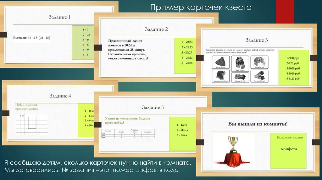 Пример карточек квестаЯ сообщаю детям, сколько карточек нужно найти в комнате.