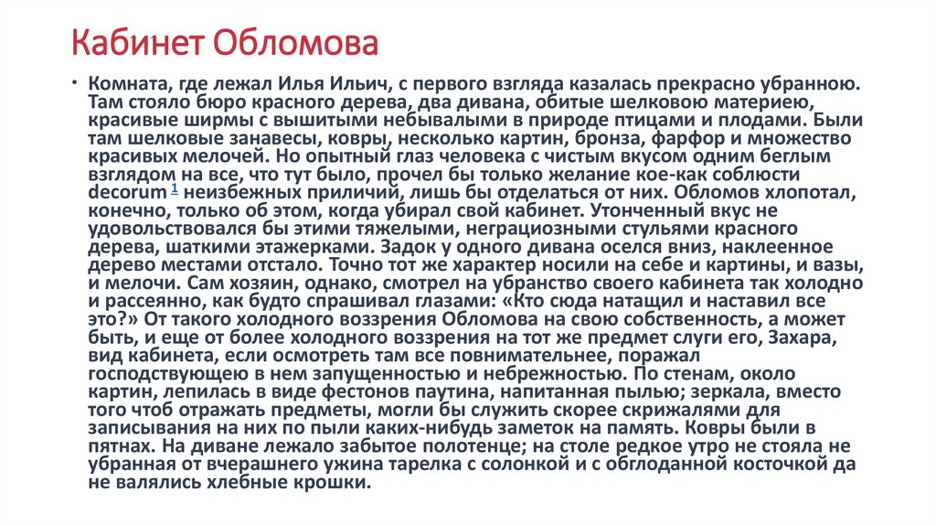 Кабинет ОбломоваКомната, где лежал Илья Ильич, с первого взгляда казалась прекрасно убранною.