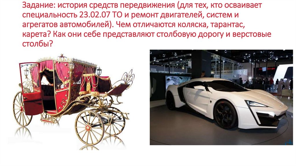 Задание: история средств передвижения (для тех, кто осваиваетспециальность 23.02.07 ТО и ремонт двигателей, систем и