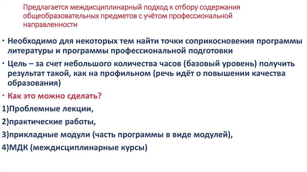 Предлагается междисциплинарный подход к отбору содержанияобщеобразовательных предметов с учётом профессиональной