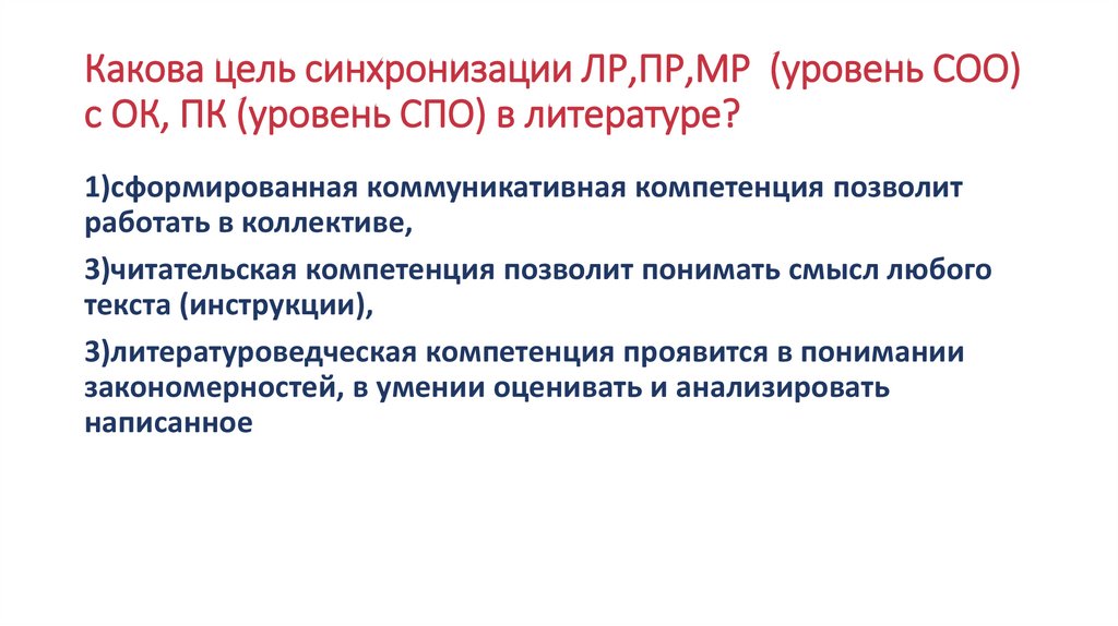 Какова цель синхронизации ЛР,ПР,МР (уровень СОО)с ОК, ПК (уровень СПО) в литературе?