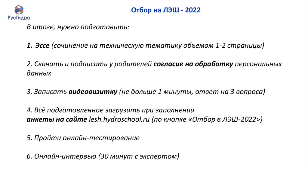 Отбор на ЛЭШ - 2022В итоге, нужно подготовить: