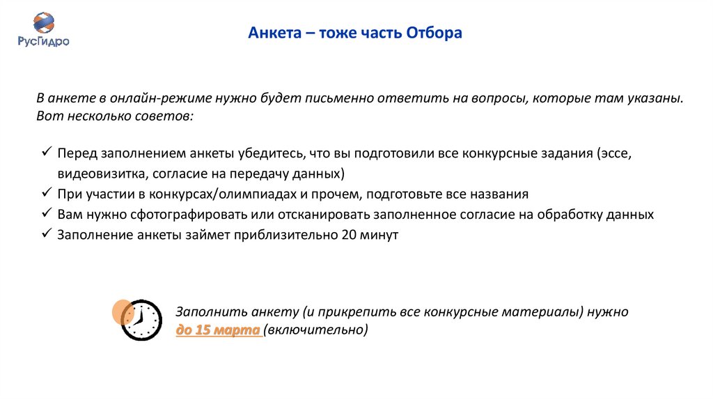 Анкета – тоже часть ОтбораВ анкете в онлайн-режиме нужно будет письменно ответить на вопросы, которые там указаны.