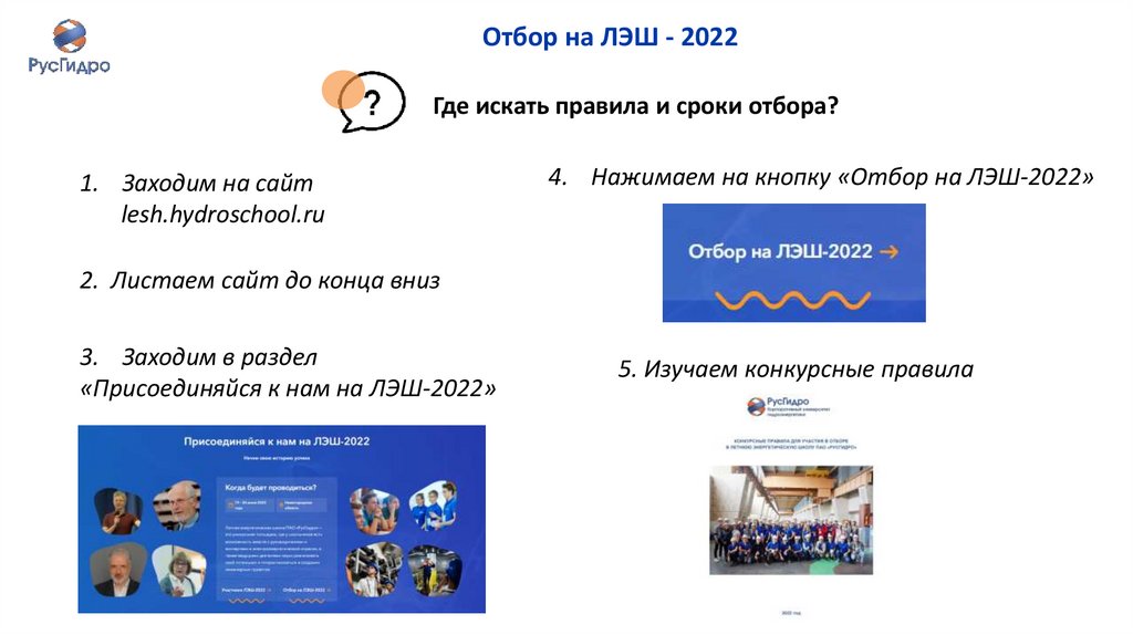 анкеты на сайте lesh.hydroschool.ru (по кнопке «Отбор в ЛЭШ-2022»)