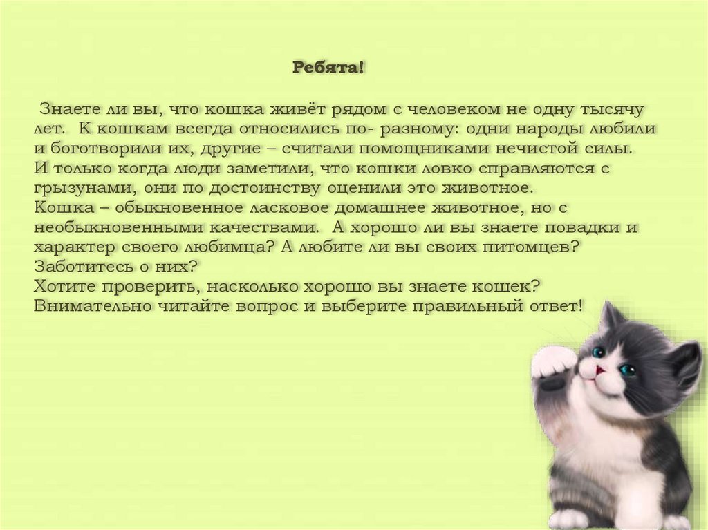 Ребята!Знаете ли вы, что кошка живёт рядом с человеком не одну тысячу