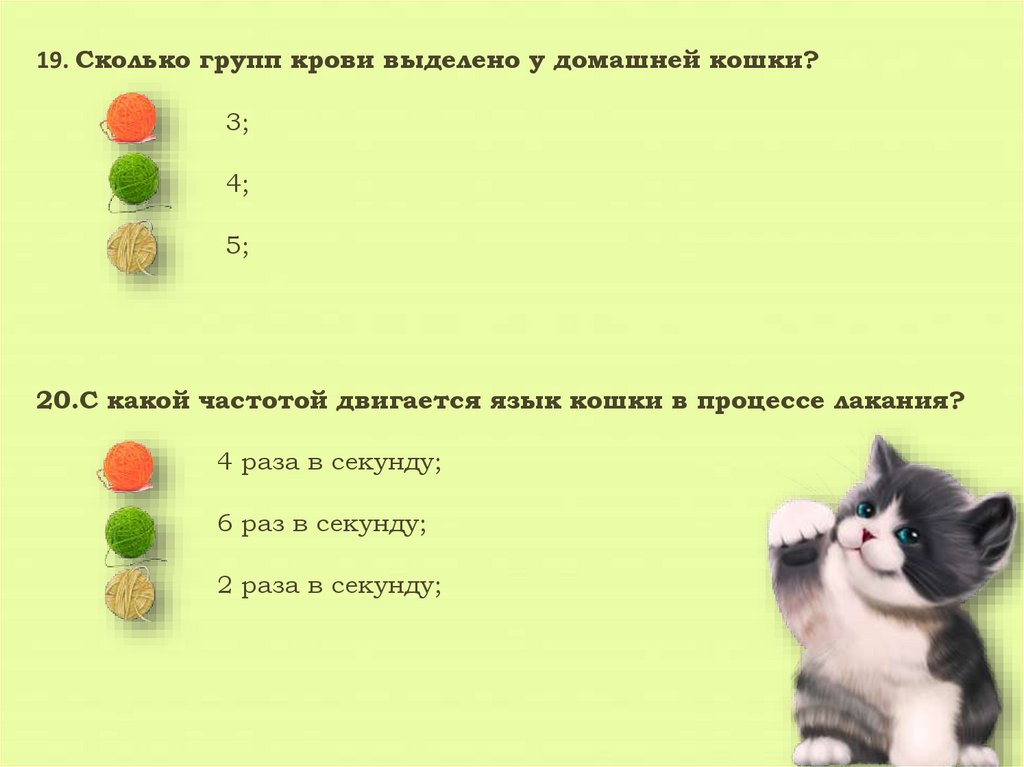 19. Сколько групп крови выделено у домашней кошки?3;
