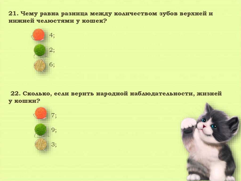 21. Чему равна разница между количеством зубов верхней инижней челюстями у кошек?