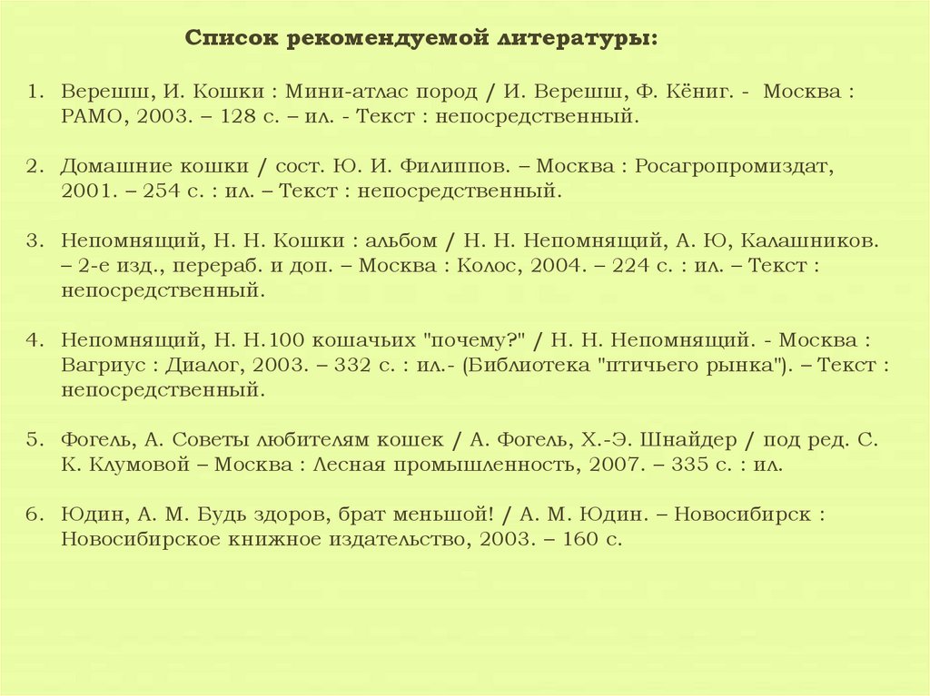 Список рекомендуемой литературы:1. Верешш, И. Кошки : Мини-атлас пород / И. Верешш, Ф. Кёниг. - Москва :