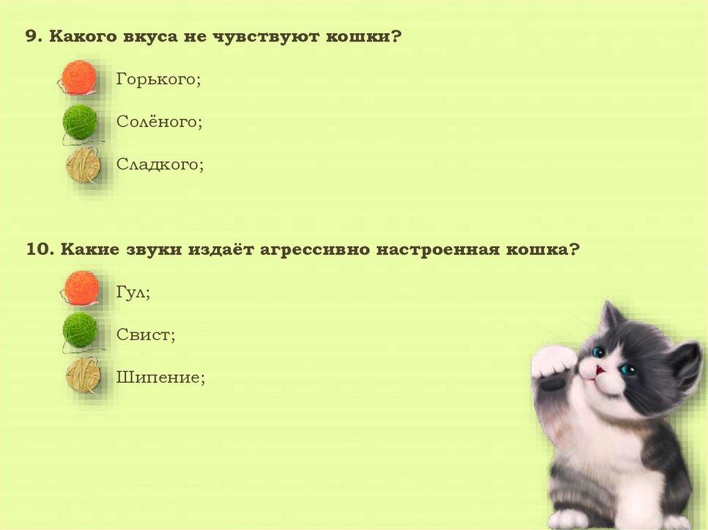 9. Какого вкуса не чувствуют кошки?Горького;