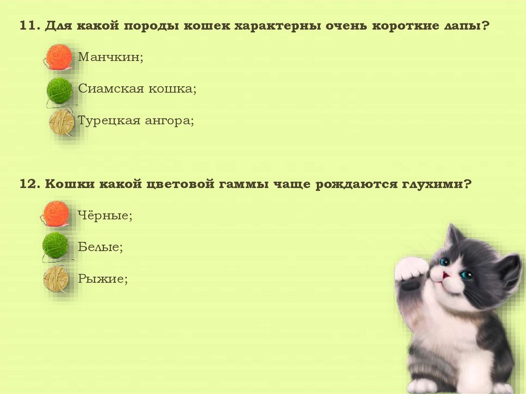 11. Для какой породы кошек характерны очень короткие лапы?Манчкин;