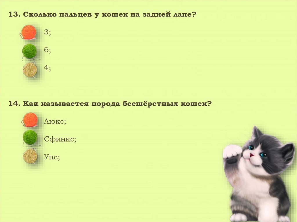 13. Сколько пальцев у кошек на задней лапе?3;