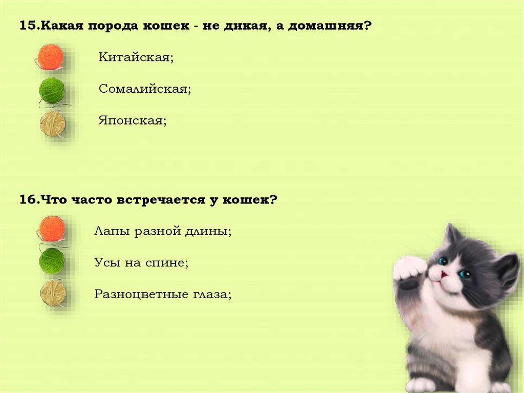 15.Какая порода кошек - не дикая, а домашняя?Китайская;