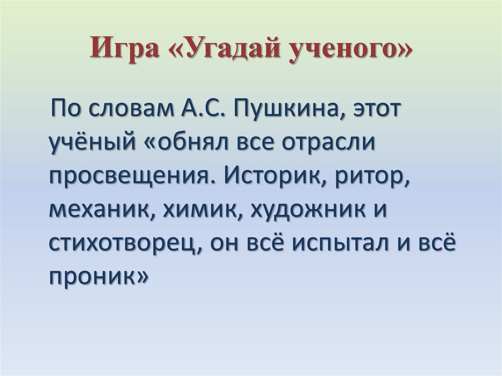 Игра «Угадай ученого»По словам А.С. Пушкина, этот